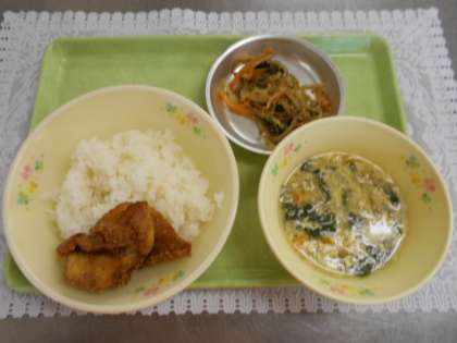 今日の献立は、ごはん、鶏肉の唐揚げ、かきたま汁、ごまあえ、牛乳でした。