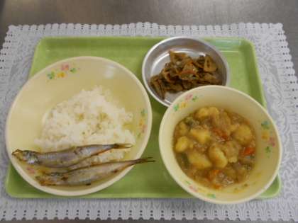 今日の献立は、ごはん、焼きししゃも、じゃがいものそぼろ煮、れんこん入りきんぴら、牛乳でした。