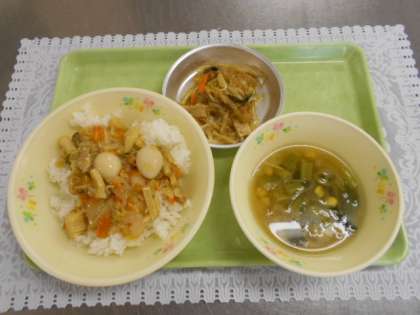 12月3日の給食 公開日 2021/12/03 更新日 2021/12/03 給食室から 今日の献立は、中華丼、えのきのスープ、春雨スープ、牛乳でした。 今日は中華料理の献立でした。午前中調理実習があったクラスもありましたが、よく食べていました。