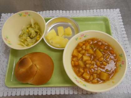今日の献立は、うずまきパン、チキンビーンズ、八王子産ブロッコリーとコーンのサラダ、りんご缶、牛乳でした。
