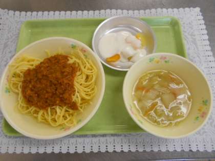 12月13日の給食 公開日 2021/12/13 更新日 2021/12/13 給食室から 今日の献立は、スパゲッティミートソース、白菜スープ、フルーツヨーグルト、牛乳でした。 今日は子供たちに大人気のスパゲッティミートソースでした。スパゲッティーは野菜をたっぷり使用しています。1年生が毎日、おいしいおいしいと言ってくれるのでうれしいです。