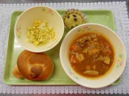 今日の献立は、ミルクパン、チキンのトマト煮込み、コールスロー、桑都カップケーキ、ジュースでした。