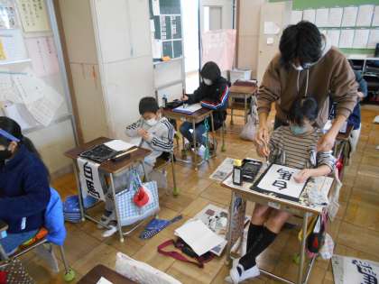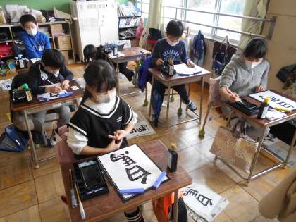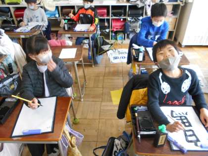書写のまとめ 公開日 2022/02/17 更新日 2022/02/17 今日の出来事 4年2組5時間目。文字の大きさに気をつけて、一年間のまとめです。筆を持つと、背筋がピンと伸びます。 校長より 授業 研究・研修 生活 行事 給食