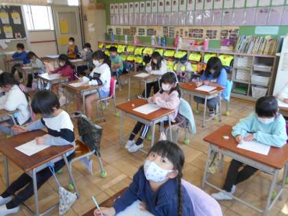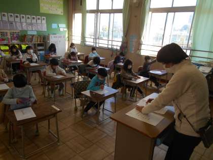 1年1組がアンケートをしている様子です。設問が難しい場合は、担任が分かりやすくかみ砕いて説明して回答をさせています。気になる回答があった場合には、個別の聴き取りを行って、ご家庭にも連絡させていただいています。