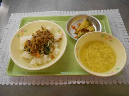 今日は八王子産のにんじん、こまつな、ブロッコリー、たまごを使用しました。切り干しビビンバは、切り干し大根が入ったビビンバです。肉だけのビビンバよりもヘルシーです。味や香りもくせはなく、子供たちもよく食べていました。