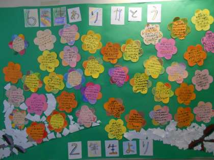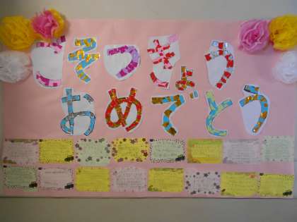 西側階段の踊り場に、6年生へのメッセージが貼りだされました。一人一人から感謝の言葉が綴られています。これは1年、2年、とちのみの言葉です。