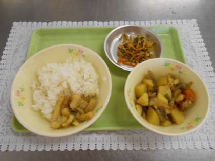 3月1日の給食 公開日 2022/03/01 更新日 2022/03/01 給食室から 今日の献立は、ごはん、いかの香味炒め、肉じゃが、ごまあえ、牛乳でした。 いかの香味炒めは簡単にできておいしいおかずです。みじん切りにしたねぎ、にんにく、しょうがをごま油で炒め、ボイルしたいかを入れさらに炒めます。みりん、しょうゆで味をつけ、最後にすりごまを入れて完成です。いかを一口大に切れば食べやすく、ごはんのおかずになります。