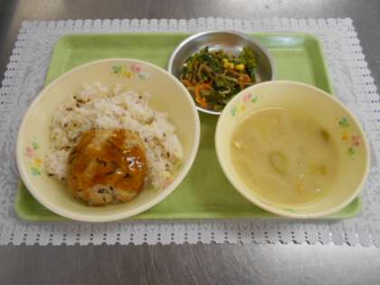 今日の献立は、ごはん、ひじきとれんこんのハンバーグ、菜の花のごまあえ、さつまいもの味噌汁、牛乳でした。
