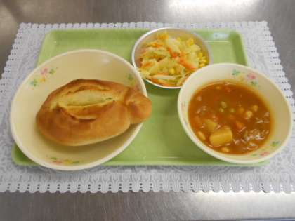 今日の献立は、ガーリックフランス、ポークビーンズ、コールスロー、牛乳でした。