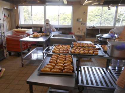 今日は6年生のリクエストで人気があったガーリックフランスとポークビーンズが登場しました。写真はガーリックフランスを作っているところです。パン工場のようにどんどん焼いていきます。