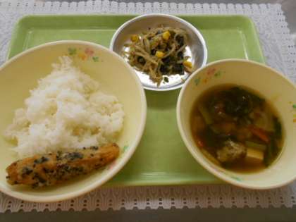 今日の献立は、ごはん、ささかまぼこの南部揚げ、女川汁、三陸わかめとツナの和え物、牛乳でした。