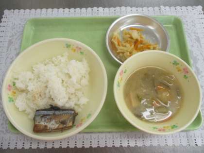 今日の献立は、ごはん、さんまのしょうが煮、田舎汁、梅おかかキャベツ、牛乳でした。