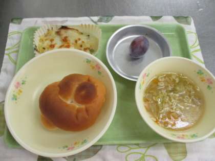 今日の献立は、ミルクパン、ポテトグラタン、ABCスープ、プルーン、牛乳でした。