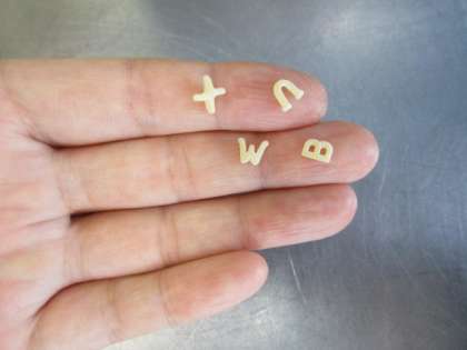 ABCスープのアルファベットマカロニは、ゆでる前はこれくらいの大きさです。水をふくんでふくらむと、この2.3倍の大きさになります。プルーンは今の時期にとれるくだものです。