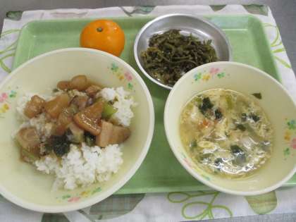 11月28日の給食 公開日 2022/11/28 更新日 2022/11/28 給食室から 今日の献立は、はち大根と豚の角煮丼、茎わかめのしょうが炒め、かきたま汁、みかん、牛乳でした。 今日は八王子産のだいこんをたっぷり使いました。だいこんは、八王子で1番とれる野菜だそうです。