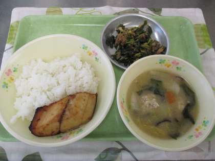 今日の献立は、ごはん、さわらの照り焼き、八王子産しょうがの鶏団子汁、八丈島産明日葉のおひたし、牛乳でした。