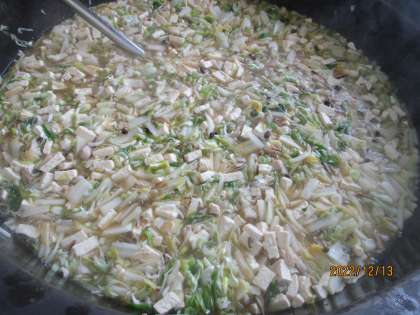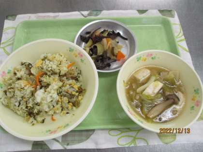 今日の献立は、高菜ライス、水炊き、あちゃら漬け、牛乳でした。