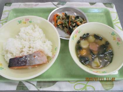 今日の献立は、ごはん、鮭の塩焼き、紅白白玉雑煮、干しエビと小松菜の煮浸し、牛乳でした。