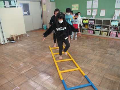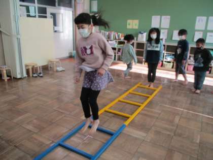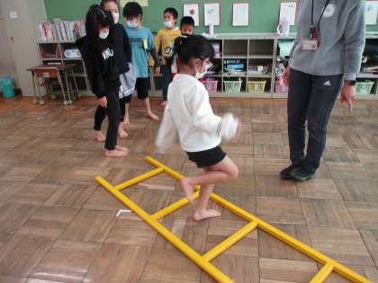 初めのうちは「むずかしいな。」と言っていた子も、「1・2・1・2」とリズムをとりながら、はしごを跳び越していました。