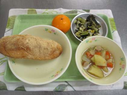 今日の献立は、きなこ揚げパン、ポトフ、わかめサラダ、ぽんかん、牛乳でした。