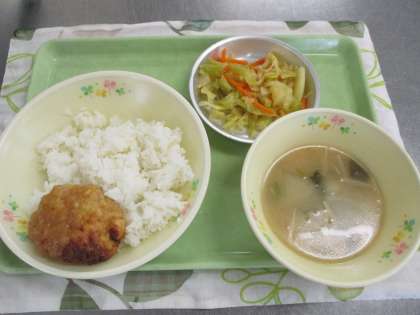 今日の献立は、ごはん、豆腐ハンバーグ・おろしソース、かぶの味噌汁、キャベツのしょうが風味、牛乳でした。