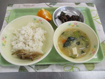 今日の献立は、ごまごはん、わかさぎ甘酢、呉汁、ひじきの炒め煮、甘平、牛乳でした。
