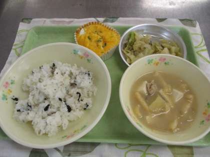 2月15日の給食 公開日 2023/02/15 更新日 2023/02/15 給食室から 今日の献立は、わかめごはん、卵焼き、さつま汁、じゃこキャベツ、牛乳でした。 みそ汁はみそを半分、早めに入れて味を染みさせ、仕上げる直前に残りのみそを入れて風味を残しています。さつまいもから甘みがほどよく出ていました。