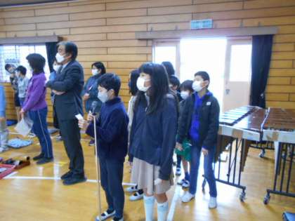 今日は、6年生を送る会がありました。代表委員の司会により6年生が入場しました。