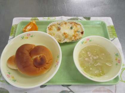 今日の献立は、ミルクパン、ポテトとアスパラガスのグラタン、キャベツと豆のスープ、カラオレンジ、牛乳でした。