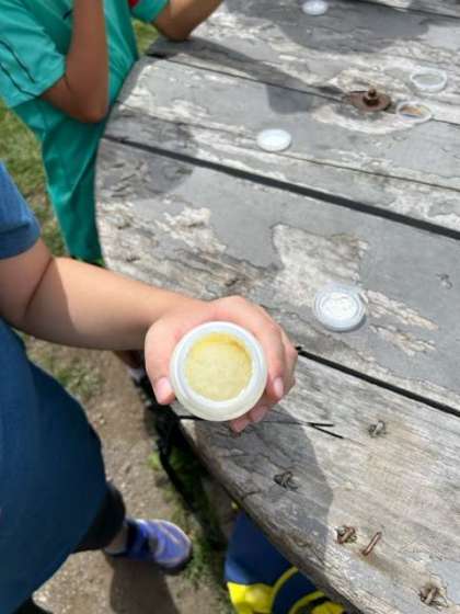 分離した水分を捨てた後、できたバターをクラッカーに載せて試食しました。
