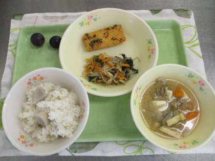 9月14日の給食 公開日 2023/09/14 更新日 2023/09/14 給食室から 今日の献立は、里芋ごはん、いかの香味焼き、彩りあえ、豚汁、ぶどう、牛乳でした。 今日は秋の味覚の里芋やぶどうが登場しました。ぶどうは巨峰です。里芋ごはんは私自身初めて作ったのでどんな感じかなと思っていましたが、崩れることもなく、ほくほくして甘かったです。