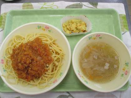 9月19日の給食 公開日 2023/09/19 更新日 2023/09/19 給食室から 今日の献立は、スパゲッティミートソース、スイートポテト、キャベツとベーコンのスープ、牛乳でした。 今日は旬のさつまいもを使ってスイートポテトを作りました。子ども達のじゃんけん合戦が盛り上がっていました。