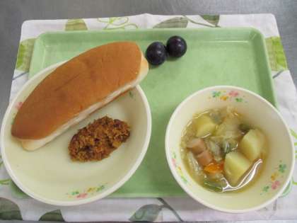 10月6日の給食 公開日 2023/10/06 更新日 2023/10/06 給食室から 今日の献立は、チリビーンズサンド、ウインナーポトフ、巨峰、牛乳でした。 チリビーンズサンドの豆は金時豆を使用しています。