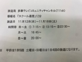 11/13 30周年記念集会の様子が多摩テレビで放送されます 公開日 2023/11/13 更新日 2023/11/13 今日の出来事 10月31日に行われた30周年記念集会の様子がたまテレビで放送されます。 ぜひご覧になってください。 校長より 授業 研究・研修 生活 行事 給食
