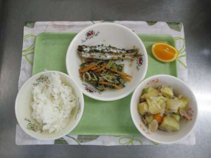 本日の献立は、ごはん、ししゃもの一味焼き、塩肉じゃが、ごまあえ、バレンシアオレンジ、牛乳でした。ふだん醤油ベースの味付けが多い肉じゃがですが、本日は塩ベースの肉じゃがで、校長先生おすすめメニューでした♪子どもたちも珍しいのか、興味津々に食べていました。