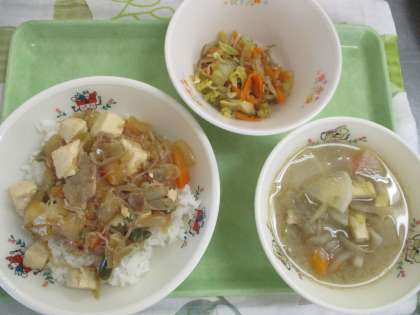 本日の献立は、ごはん、肉豆腐、根菜汁、じゃこの和え物、牛乳でした。