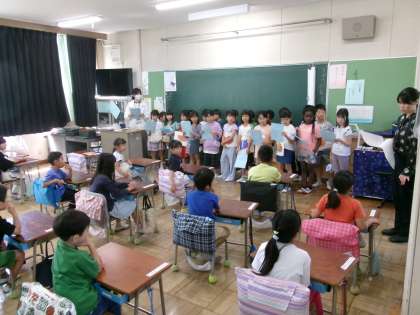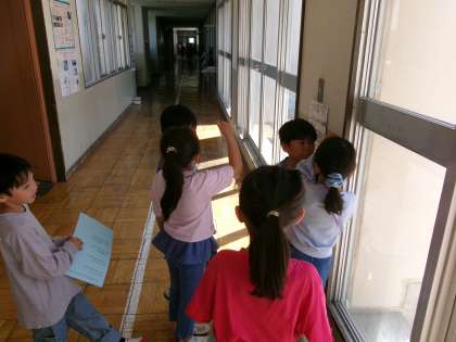 2年生は調べてカードに書いたことを一生懸命説明したり、手をつないで連れてあげたりしていました。4階のバルコニーに出た人たちは、「あ、時計がこんなに大きく見える!」と驚いていました。どちらの学年の子にとってもよい学習だったと思います。