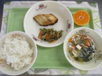 本日の献立は、ごはん、さわらの照り焼き、小松菜汁、よごし、みかん、牛乳でした。今...