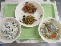 本日の献立は、わかめごはん、ホキのごまがらめ、小松菜の和え物、豚汁、牛乳でした。...