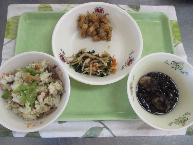 1月9日の献立は、かやくごはん、いかのねぎ塩焼き、野菜のおかか和え、白玉あずき、...