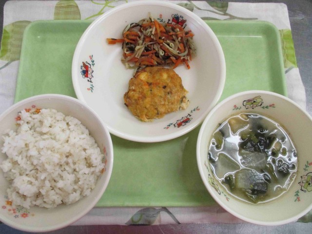 本日の献立は、麦ごはん、ぎせい豆腐、野菜ののり和え、ほうれん草のみそ汁、牛乳でし...