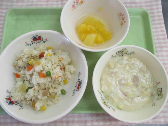 本日の献立は、コーンピラフ、八王子産白菜のクリームシチュー、ゆず蜜フルーツ、牛乳...