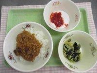 本日の献立は、チリコンカンライス、ツナサラダ、ヨーグルトいちごソースがけ、牛乳で...