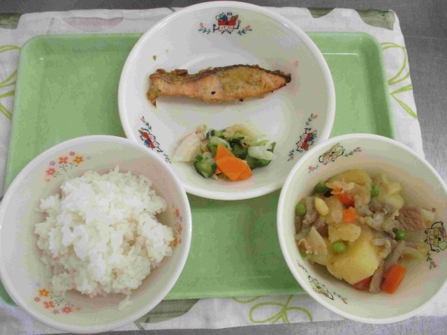 【4月25日の献立】・ごはん・鮭のごまみそ焼き・新玉ねぎの肉じゃが・だし塩の浅漬...