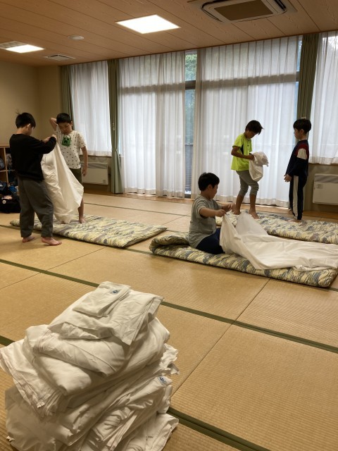 2日目がスタートしました。子どもたちは元気に起床し、仲間と協力しながら布団の片付けをしています。部屋のリーダーさんも、下級生の面倒をよくみてくれています。