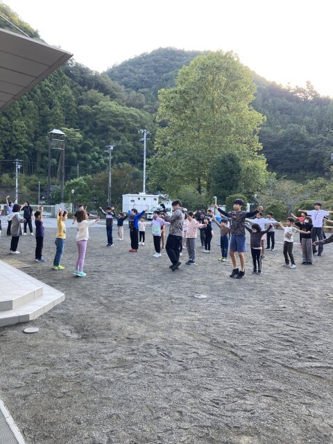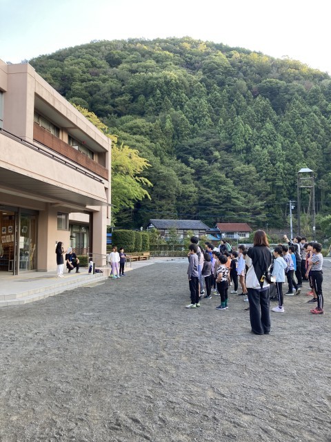 澄んだ山間の空気に包まれながら、朝会を実施しました。子どもたちの司会進行も上手で、2日目の良きスタートが切れました。