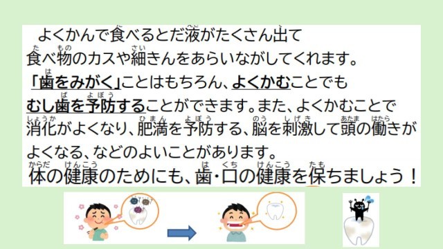 よく噛んで食べると、だ液がたくさん出て食べ物のかすや細菌を洗い流してくれます。