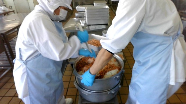 トマト系の味つけをしている大豆ピラフは、大豆が入っているのに人気の献立です。