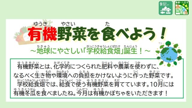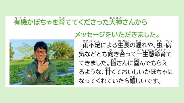 有機野菜とは、科学的に作られた肥料や農薬を使用しないでなるべく行きものや環境に負担をかけないよう作った野菜です。自然のチカラでたくましく育ったかぼちゃは野菜本来の味がすると言うことでした。