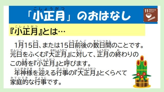 1月15日前後の数日間のことを「小正月(こしょうがつ)」といい、正月の終わりのことをいいます。